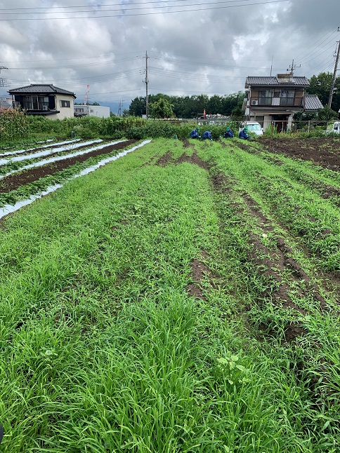 恵みの雨で育つのは、野菜だけではありません。雨が降れば、雑草も伸び伸びと育ってしまいます。本日(6月29日)は、梅雨の晴れ間に除草です。長ネギが定植してある畝と畝間の除草をしました。