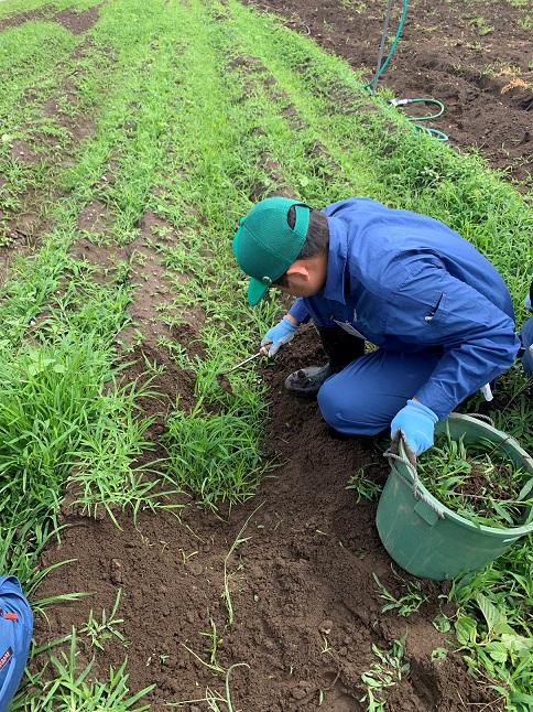 除草剤を撒くわけにはいきませんし、長ネギは畝間が狭いので耕運機を入れることもできません。5cm間隔で植えてある苗の間の雑草は、手でひとつひとつ抜きました。まだ小さい長ネギの苗と雑草を区別して、長ネギの根を傷つけないように除草をするのは、かなりの集中力が必要となります。湿気が高く蒸し暑い中、広い農地の除草を半日かけて終えました。長時間の除草作業でしたが、誰一人弱音を吐かず、明るく励まし合って除草をやり遂げ、気分はすっきり!農業生産コースのモットー『明るく楽しく働こう』を実践しているコースの生徒たちです(^-^)