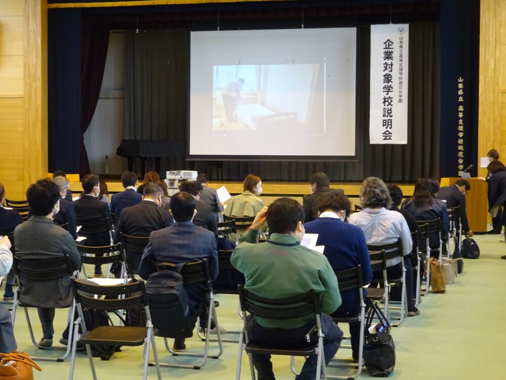 山梨県立高等支援学校桃花台学園 > 学校から > 令和5年度企業対象学校説明会 2023年11月13日カテゴリー: 学校から 行事・活動 令和5年度企業対象学校説明会 11月10日(金)に企業対象学校説明会を実施しました。今年度は49社69名の企業の方々に御参加いただきました。初めて学校を訪問してくださる企業の御担当者もあり、本校や障害者雇用に関心をもっていただいていることが分かり、嬉しく感じました。説明会では、「学校説明会」「授業見学」「分科会(➀生徒に聞きたい!話したい!➁障害者雇用の実態➂障害者雇用はじめの一歩)」「情報交換会」を実施しました。半日でしたが、本校の生徒の様子や取組、障害者雇用の実状を知っていただけたと思います。 御参加くださいました企業の皆様には、御多忙のところ、またお足元の悪い中、本校へお越しいただき誠にありがとうございました。今後ともよろしくお願いいたします。(進路指導部)