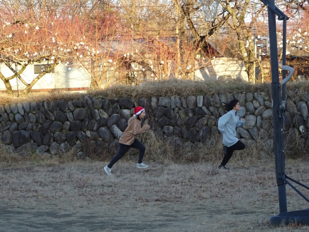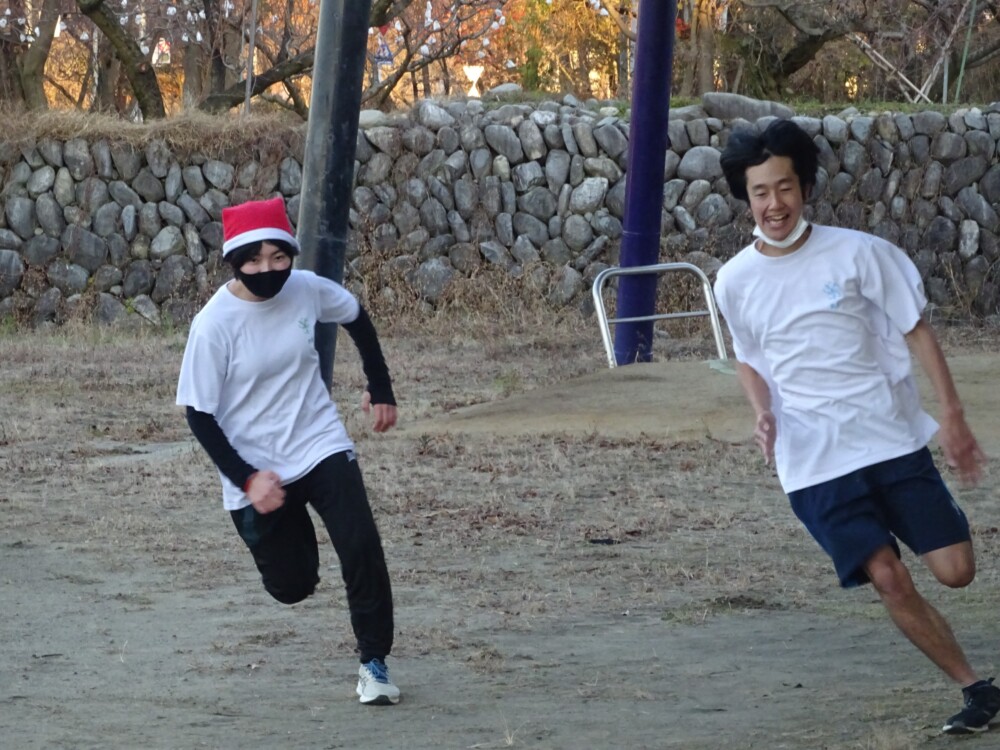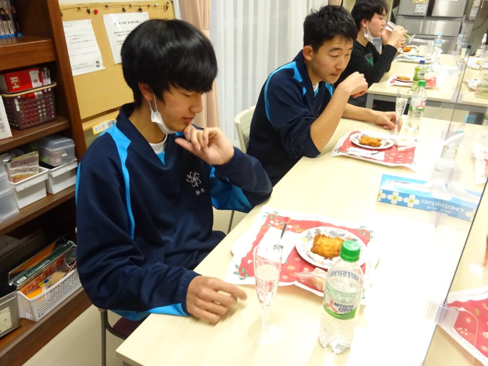 12月13日(水)に2学期のまとめの会としてみんなで「増え鬼」をしました。クリスマスも近いということで、鬼になったらサンタクロースの帽子やトナカイのカチューシャを着用して追いかけるルールで行いました。サンタクロースがどんどん増えていきとても賑やかでした。増え鬼の後は、談話室で感染症対策をしてフライドチキンやデザートを食べました。体を動かしチキンも食べ、全員とても満足そうな表情でした。