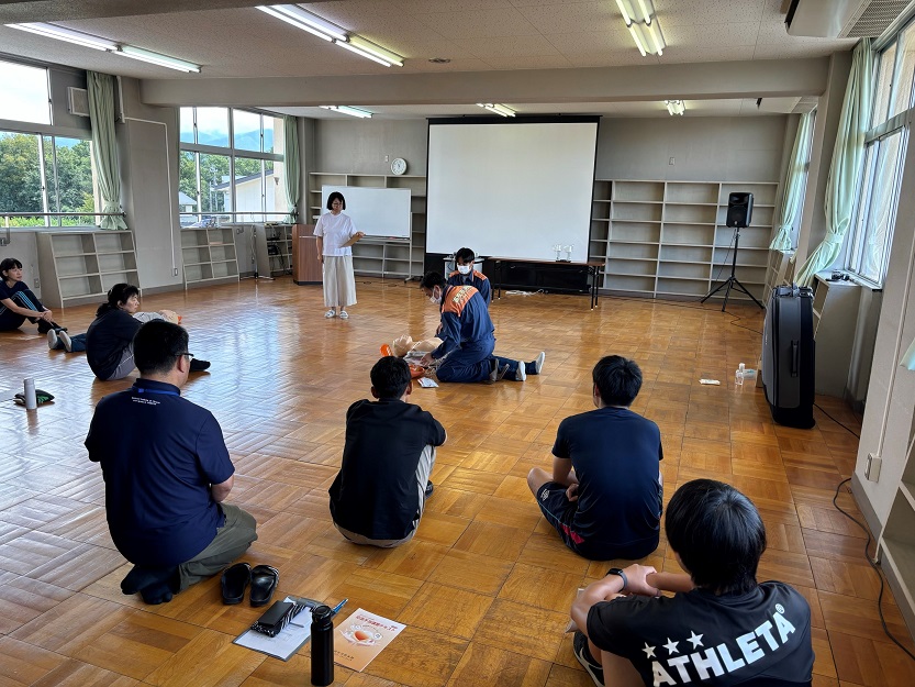 山梨県立高等支援学校桃花台学園 > 学校から > 職員対象 心肺蘇生法講習会 2024年8月30日カテゴリー: 学校から 職員対象 心肺蘇生法講習会 笛吹消防署の救急救命士の方に講師をしていただき、職員対象の心肺蘇生法講習会を行いました。 講師の指導のもと、傷病者発見時の対応やAEDの使用方法について、デモンストレーションを行いながら、対応について学びました。