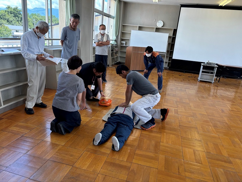 講師の指導のもと、傷病者発見時の対応やAEDの使用方法について、デモンストレーションを行いながら、対応について学びました。