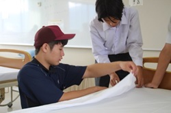 笛吹高校の生徒に、ベッドメイキングを教えていただき、本校の生徒は、窓清掃を教えました。ベッドメイキングでは、笛吹高校の生徒が丁寧にわかりやすく教えてくれたおかげで、スムーズに作業を行うことができました。