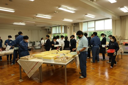 全校生徒、先生が来店する販売会なので食品加工コース23名が総力を尽くして準備しました。6月にローソンで発売されたコラボパン「もも香るデニッシュ」の思い出を残すために製造した「トーカクルクル桃ジャムカスタード」も大収穫祭に先駆けて並びました。昼休みの開店時間には、10人以上が列を作り、大盛況の販売会でした。