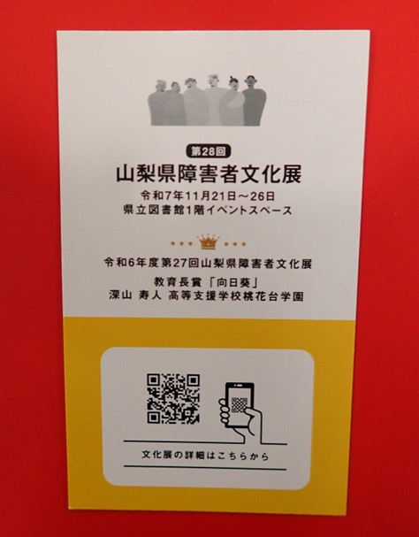 今年度も「第28回山梨県障害者文化展(総合展)」が11月21日(金)~26日(水)まで山梨県立図書館にて開催されます。障害者文化展入場の際にも、こちらの絵カードが配られます。