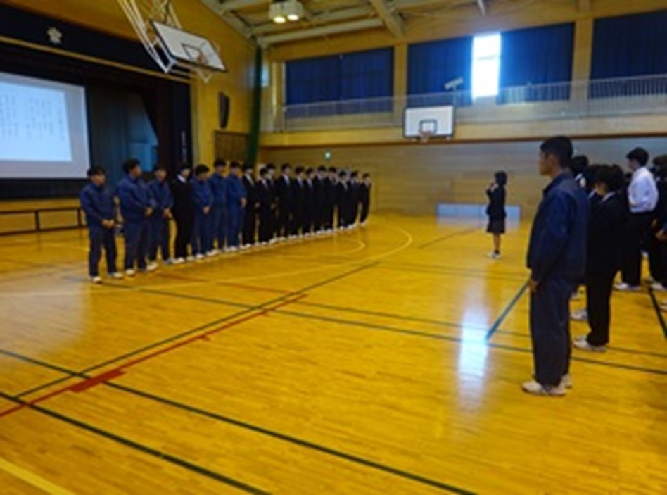 代表生徒が、選手一丸となって新たな気持ちで大会に臨む決意を述べると、全校生徒は応援歌で仲間たちに温かいエールを送りました。