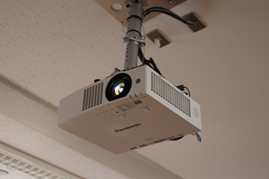 プロジェクターは視聴覚室の天井に設置。普段の授業で活用します。鮮明な画像で、よりわかりやすい学習が期待できます。