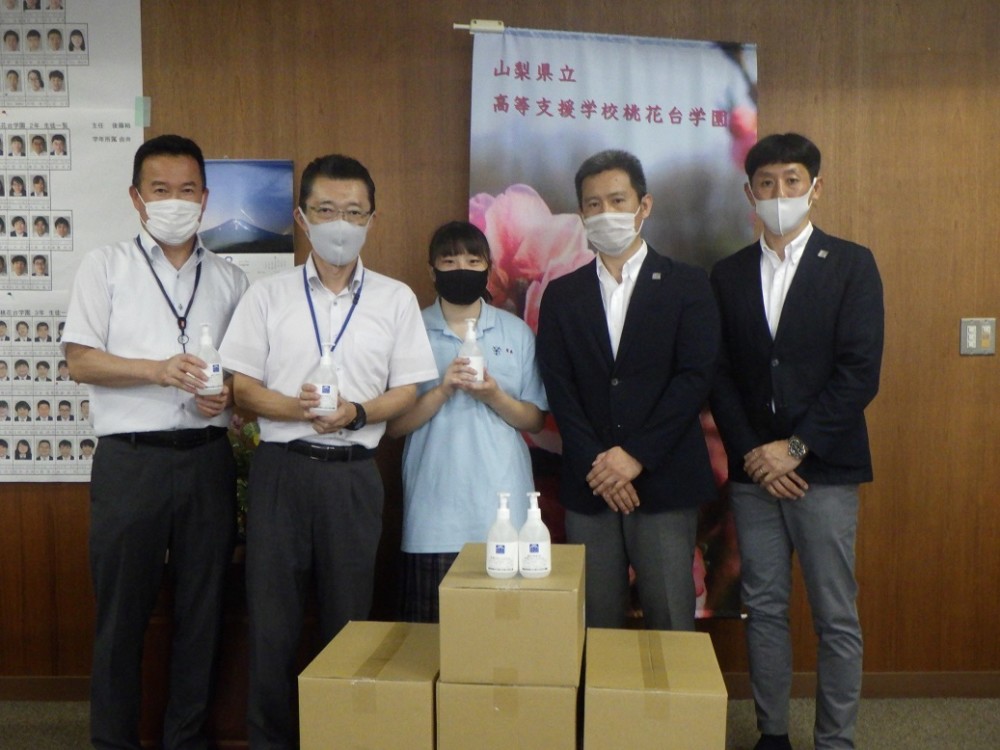 山梨県立高等支援学校桃花台学園 > 学校から > 手肌クリーンジェルをいただきました 2020年8月28日カテゴリー: 学校から 手肌クリーンジェルをいただきました 本校卒業生も現場実習や就労でお世話になっている、松山樹脂株式会社様から手肌クリーンジェルを240本寄贈していただきました。使用した生徒から「(僕は、肌が弱いので手に沁みやすいのですが、)これは痛くない。」との感想が印象的でした。新型コロナウイルスが広がっている中、いただいた手肌クリーンジェルを使って皆で予防に努めていきます。